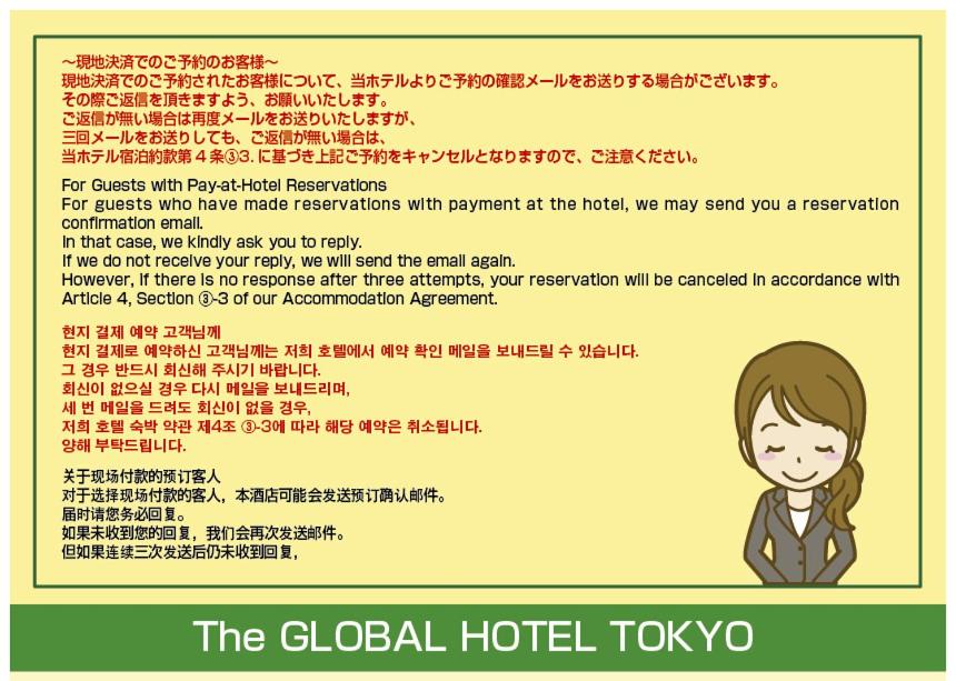 The Global hotel Tokyo can speak up to 3 languages which includes English for visitors that prefer this language. Please refer to the "Amenities and facilities" section and in the "Languages spoken" category to find out what different languages this property supports.
